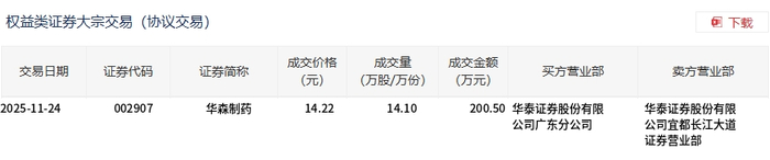 11月24日,华森制药大宗交易成交14.1万股,成交额200.5万元,占当日总成交额的5.33%,成交价14.22 元,较市场收盘价16.09元折价11.62%。 | 交易日期 | 证券代码 | 证券简称 | 成交价格 | 成交量 | 成交金额 (万元) | 买方营业部 | 卖方营业部 | | --- | --- | --- | --- | --- | --- | --- | --- | | | | | (元) | (万股/万份) | | | | | 2025-11-24 | 002907 | 华森制药 | 14.22 | 14.10 | | 200.50 华泰证券股份有限 | 华泰证券股份有限 | | | | | | | | 公司广东分公司 | 公司宜都长江大道 | | | | | | | | | 证券营业部 | ...