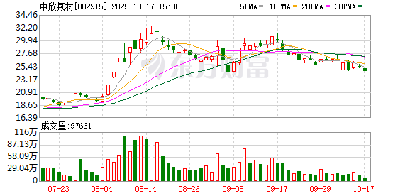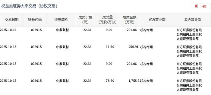 | 权益类证券大宗交易(协议交易) | | | | | | | 团 下载 | | --- | --- | --- | --- | --- | --- | --- | --- | | 交易日期 | 证券代码 | 证券简称 | 成交价格 (元) | 成交量 (万股/万份) | 成交金额 (万元) | 买方营业部 | 卖方营业部 | | 2025-10-17 | 002915 | 中欣氟材 | 22.62 | 12.00 | 271.44 机构专用 | | 东方证券股份有限 | | | | | | | | | 公司绍兴上虞梁祝 | | | | | | | | | 大道证券营业部 | 10月17日,中欣氟材大宗交易成交12万股,成交额271.44万元,占当日总成交额的1.1%,成交价22.62 元,较市场收盘价24.55元折价7.86%。 ...