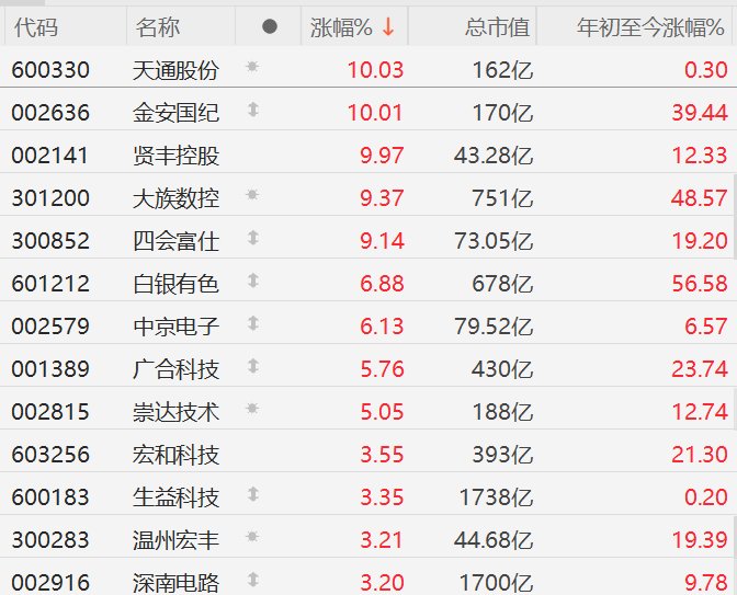 | 代码 | 名称 | 收盘价 | 涨跌幅 | 成交量(手) | 成交额(元) | | --- | --- | --- | --- | --- | --- | | 002636 | 金安国纪 | 25.63 | 10.00% | 81.12万 | 20.51亿 | | 603920 | 世运电路 | 65.71 | 9.99% | 43.29万 | 27.81亿 | | 300903 | 科翔股份 | 26.22 | 8.39% | 60.25万 | 15.50亿 | | 688539 | 高华科技 | 49.89 | 4.77% | 10.34万 | 5.14亿 | | 300657 | 弘信电子 | 31.45 | 3.97% | 49.60万 | 15.67亿 | | 603175 | 超颖电子 | 73.68 | 3.14% | 6.63万 | 4.83亿 | | 600563 | 法拉电子 | 117.56 | 2.72% | 5.89万 | 6.88亿 | | 661Z00 | *ST东晶 | 10.20 | 2.41% | 3.20万 | 3233.08万 | | 920491 | 圆迪威 | ...