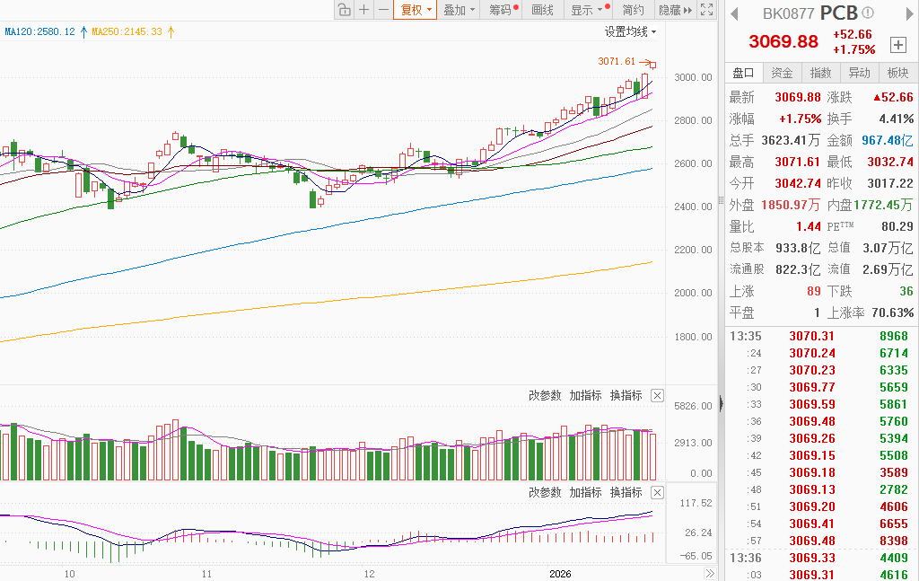 Core Viewpoint - The PCB sector in A-shares is experiencing a strong upward trend driven by the explosive growth of AI applications, with significant performance improvements expected in the industry [1][3]. Group 1: Industry Performance - As of January 21, 2026, the PCB sector index has seen a cumulative increase of over 8% since the beginning of the year, with a daily rise of 3.77% on January 21 [1][4]. - The demand for high-end circuit boards, particularly HDI and high-layer boards, is being driven by the rapid penetration of AI servers and smart driving technologies [3]. - The global PCB market is projected to grow by approximately 5.8% in 2024 and 6.8% in 2025, reaching an estimated value of about $94.661 billion by 2029, with a compound annual growth rate of around 5.2% [3]. Group 2: Financial Performance - As of January 20, 2026, PCB concept stocks have seen a net financing inflow of 1.674 billion yuan, with nine stocks, including Xingsen Technology and Yongda Photonics, having net purchases exceeding 100 million yuan [4]. - Among nearly 50 PCB stocks in A-shares, 37 companies reported year-on-year profit growth or reduced losses in the first three quarters of 2025, indicating a strong recovery in the industry [4]. - Jin'an Guoji expects a net profit of 280 million to 360 million yuan for 2025, representing a year-on-year increase of 655.53% to 871.40%, driven by improved market conditions and optimized product structure [5]. Group 3: Company Developments - Shenghong Technology anticipates a net profit of 4.16 billion to 4.56 billion yuan for 2025, reflecting a year-on-year growth of 260.35% to 295%, supported by large-scale production in AI computing and data center sectors [5]. - Shenzhen South Circuit achieved a net profit of 2.326 billion yuan in the first three quarters of 2025, setting a record for annual net profit since its listing, and is actively expanding production capacity [6]. - The entire PCB supply chain is benefiting, with Inno Laser reporting nearly 90 million yuan in orders for PCB forming equipment since 2025, indicating a prosperous industry landscape [6].
