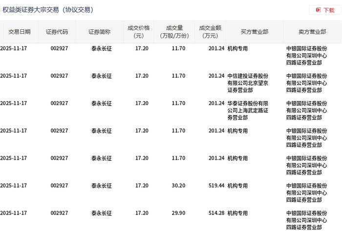 11月17日,泰永长征大宗交易成交118.6万股,成交额2039.92万元,占当日总成交额的4.23%,成交价 17.2元,较市场收盘价20.34元折价15.44%。 | 交易日期 | 证券代码 | 证券简称 | 成交价格 | 成交量 | 成交金额 买方营业部 | 零方营业部 | | --- | --- | --- | --- | --- | --- | --- | | | | | (元) | (万股/万份) | (万元) | | | 2025-11-17 | 002927 | 泰永长征 | 17.20 | 11.70 | 201.24 机构专用 | 中超国际证券股份 | | | | | | | | 有限公司深圳中心 | | | | | | | | 四路证券营业部 | | 2025-11-17 | 002927 | 泰永长征 | 17.20 | 11.70 | 201.24 中信建投证券股份 | 中银国际证券股份 | | | | | | | 有限公司北京里京 | 有限公司深圳中心 | | | | | | | 证券营业部 | 四路证券营业部 | | 2025-11-17 | 002927 | 泰永长征 | 17 ...