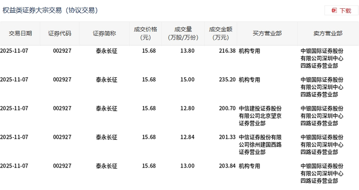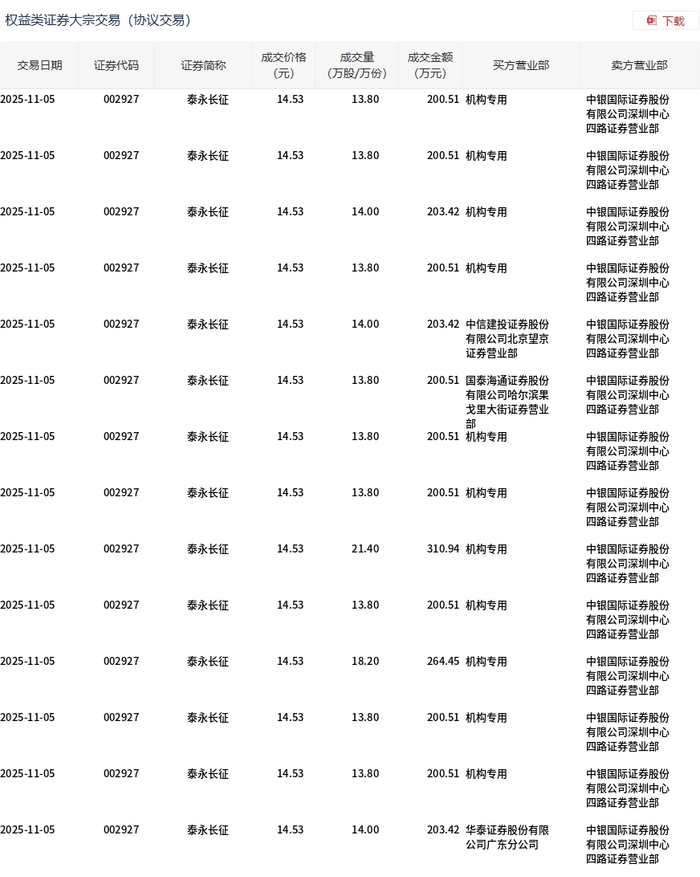 11月5日,泰永长征大宗交易成交205.8万股,成交额2990.24万元,占当日总成交额的8.93%,成交价 14.53元,较市场收盘价16.55元折价12.21%。 | 交易日期 | 证券代码 | 证券简称 | 成交价格 | 成交量 | 成交全额 买方营业部 | 卖方营业部 | | --- | --- | --- | --- | --- | --- | --- | | | | | (元) | (万股/万份) | (万元) | | | 2025-11-05 | 002927 | 泰永长征 | 14.53 | 13.80 | 200.51 机构专用 | 中银国际证券股份 | | | | | | | | 有限公司深圳中心 | | | | | | | | 四路证券营业部 | | 2025-11-05 | 002927 | 泰永长征 | 14.53 | 13.80 | 200.51 机构专用 | 中银国际证券股份 | | | | | | | | 有限公司深圳中心 | | | | | | | | 四路证券营业部 | | 2025-11-05 | 002927 | 泰永长征 | 14.53 | 14.00 | 203.4 ...