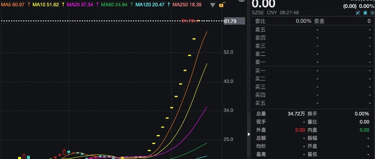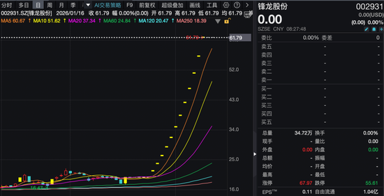 受优必选拟入主的消息催化,锋龙股份股价暴涨超200%,实现13连板。该公司停牌核查完成,股票将于明天复牌。 | 分时 多日 日 周 月 李 :▼ AI交易策略 F9 前复权 超级叠加 画线 工具 Q ② > | 锋龙股份 | | 002931 | | --- | --- | --- | --- | | 002931.SZ[锋龙股份] 2026/01/16 收61.79 幅 0.00%(0.00) 开 61.79 高 61.79 低 61.79 均 61.79 ma | | | 0.00(USD | | MA5 60.67 ↑ MA10 51.62 ↑ MA20 37.34 ↑ MA60 24.84 ↑ MA120 20.47 ↑ MA250 18.39 V n' | 0.00 | | (0.00) 0.00% | | | SZSE CNY 08:27:48 | | 10 + | | 61.79 | 委比 | 0.00% 委差 | 0 | | | 卖五 | | | | | 卖四 | | | | | 英三 | | | | 52.0 | 卖二 | | | | | 卖一 | | | | 43.0 | | | | | ...