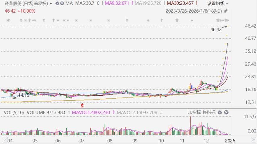 1月7日晚间,锋龙股份(002931.SZ)发布 《 股票交易严重异常波动暨风险提示公告》 , 公告称,公司股票自2025年12月25日至2026年1月7日 连续8个交易日涨停, 累计涨幅偏离值超过100% ,显著偏离大盘指数,短期波动幅度较大,已明显偏离市场走势,存在较高的炒作风险, 如 未来公司股票价格进一步异常上涨,公司可能申请停牌核查 。 1月7日,锋龙股份延续狂热走势,再度一字涨停,截至收盘,股价报42.2元/股,这已是该公司自2025年12月25日复牌以来的连续第8个一字涨 停板,区间累计涨幅达114.43%,加上停牌前一个交易日涨停,该股已9连板。 来源丨锋龙股份公告 部分内容引自2 1世纪经济报道(记者:李益文) 编辑丨金珊 SFC A股61岁女副董事长,主动放弃百万年薪 "整容要交税"刷屏,律师:并非针对消费者 央行连续14个月增持黄金,背后信号很大 21君荐读 锋龙股份在最新公告中 强调,截至目前,公司主营业务仍为园林机械零部件、汽车零部件和液压零部件的研发、生产和销售,未发生重大变 化。优必选暂无在未来12个月内改变上市公司主营业务或者对上市公司主营业务做出重大调整的明确计划,以及在未来 ...