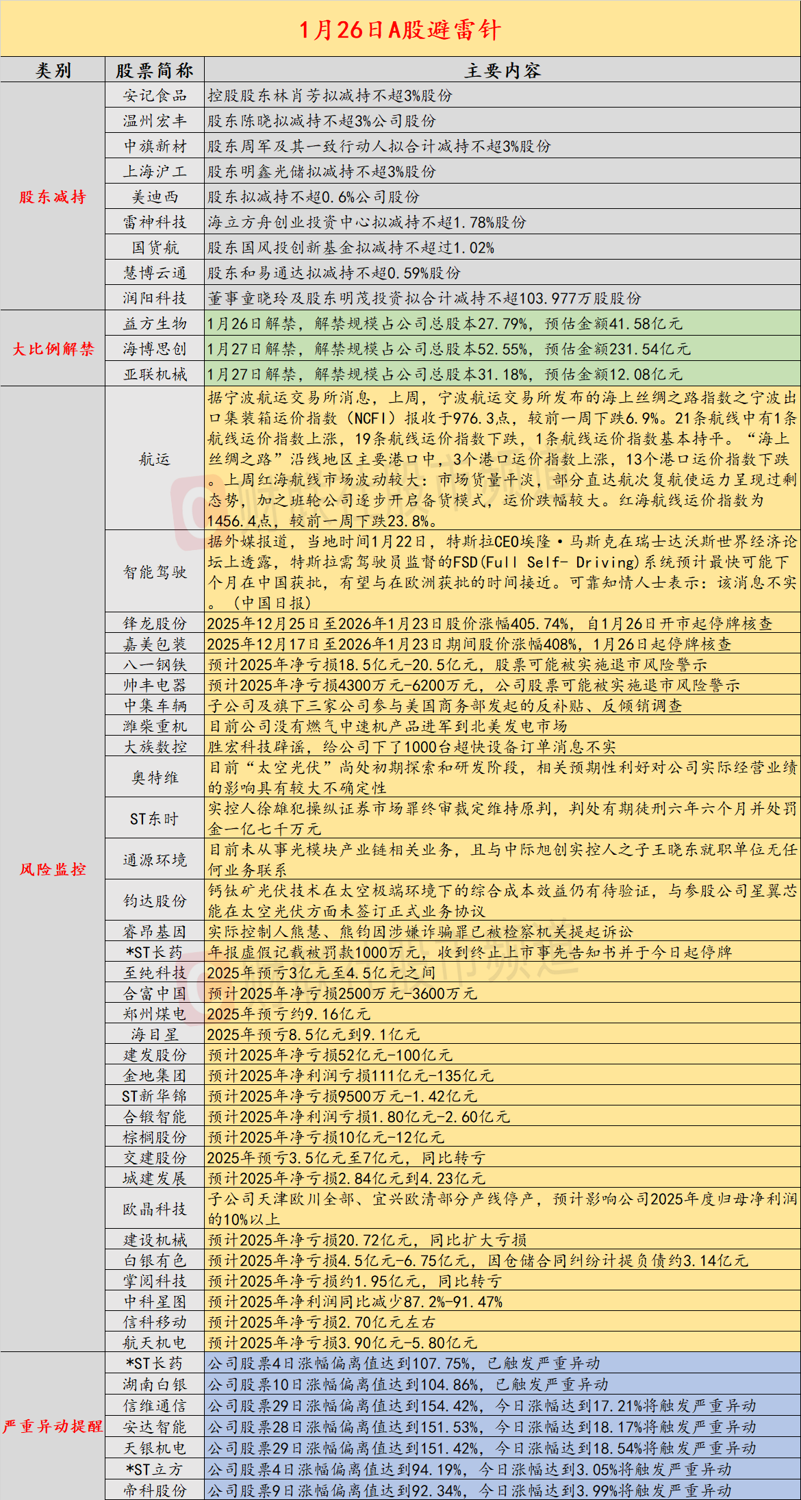 Economic Information - The Ningbo Shipping Exchange reported that the Ningbo Export Container Freight Index (NCFI) fell to 976.3 points, a decrease of 6.9% from the previous week, with 19 out of 21 routes experiencing a decline in freight rates [2] - The Red Sea route saw significant fluctuations, with its freight index dropping by 23.8% to 1456.4 points due to oversupply and a lack of cargo volume [2] Regulatory Updates - The China Securities Regulatory Commission (CSRC) announced new guidelines for the performance comparison benchmarks of publicly raised securities investment funds, effective from March 1, 2026, emphasizing the need for improved internal control mechanisms and investment style stability management [3] Market Alerts - Fenglong Co., Ltd. experienced a stock price increase of 405.74% from December 25, 2025, to January 23, 2026, and will be suspended for verification starting January 26, 2026 [5] - Jiamei Packaging reported a stock price increase of 408% during the same period and will also be suspended for verification [5] - Several companies, including Anji Food and Wenzhou Hongfeng, announced plans to reduce shareholdings by up to 3% [5] Financial Forecasts - Companies such as ST Changyao and Shuaifeng Electric are expected to report significant losses in 2025, with ST Changyao projecting a net loss of 18.5 billion to 20.5 billion yuan, potentially facing delisting risk [5][10] - Other companies, including Zhengzhou Coal and Gold Group, forecast losses ranging from 250 million to 135 billion yuan for 2025 [10] International Market Updates - U.S. stock indices showed mixed results, with the Dow Jones falling by 0.58% and the Nasdaq rising by 0.28%, while Intel's stock plummeted over 17%, marking its largest single-day drop since August 2024 [6][7] - The U.S. Treasury Department imposed new sanctions on entities related to Iran's energy and shipping sectors, affecting several shipping companies and their associated vessels [7]