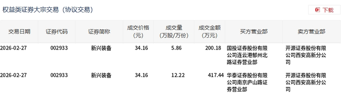 2月26日,新兴装备大宗交易成交25.86万股,成交额883.38万元,占当日总成交额的5.9%,成交价34.16 元,较市场收盘价37.25元折价8.3%。 | 交易日期 | 证券代码 | 证券简称 | 成交价格 | 成交量 | 成交全额 买方营业部 | 卖方营业部 | | --- | --- | --- | --- | --- | --- | --- | | | | | (元) | (万股/万份) | (万元) | | | 2026-02-26 | 002933 | 新兴装备 | 34.16 | 10.00 | 341.60 招商证券股份有限 | 开源证券股份有限 | | | | | | | 公司西安北大街证 | 公司西安高新分公 | | | | | | | 券营业部 | n | | 2026-02-26 | 002933 | 新兴装备 | 34.16 | 10.00 | 341.60 国泰海通证券股份 | 开源证券股份有限 | | | | | | | 有限公司深圳红荔 | 公司西安高新分公 | | | | | | | 西路证券营业部 | ロ | | 2026-02-26 | 002933 | 新兴装备 ...