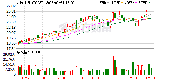格隆汇2月24日丨兴瑞科技(002937.SZ)公布,截至2026年2月24日,公司通过股份回购专用证券账 户以集中竞价交易方式回购公司股份共计298万股,占公司总股本的比例为1.00%,最高成交价为25.572 元/股,最低成交价为16.739元/股,累计支付的资金总金额约为6840.11万元(不含交易费用)。本次回购 符合相关法律法规的要求,符合公司既定的回购方案。 ...