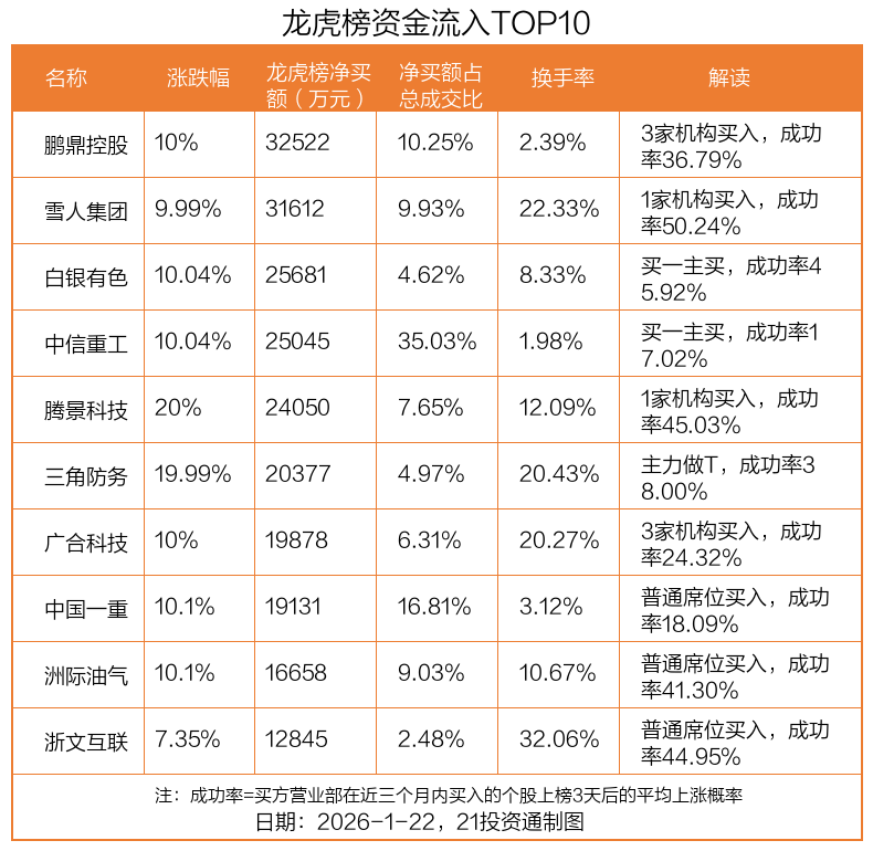 1月22日,上证指数上涨0.14%,深证成指上涨0.5%,创业板指上涨1.01%。盘后龙虎榜数据显示,共有51只个股 因当日异动登上龙虎榜,资金净流入最多的是鹏鼎控股(002938.SZ),达3.25亿元。 据21投资通智能监测,30只个股龙虎榜出现了机构的身影,北向资金参与龙虎榜中的个股共涉及26只。 3.25亿资金抢筹鹏鼎控股,6.59亿资金出逃湖南白银 51只上榜的龙虎榜个股中,30只个股被净买入,21只个股被净卖出。其中,资金净买入最多的是鹏鼎控股,达 3.25亿元,占总成交金额的10.25%。鹏鼎控股当日收盘上涨10%,换手率为2.39%。 | 名称 | 涨跌幅 | 龙虎榜净买 | 净买额占 | 换手率 | 解读 | | --- | --- | --- | --- | --- | --- | | | | 额(万元) | 总成交比 | | | | 鹏鼎控股 | 10% | 32522 | 10.25% | 2.39% | 3家机构买入,成功 | | | | | | | 率36.79% | | 雪人集团 | 9.99% | 31612 | 9.93% | 22.33% | 1家机构买入,成功 | | | ...