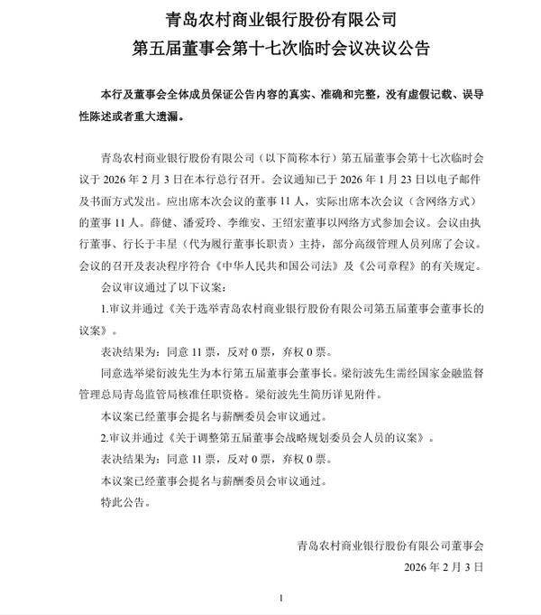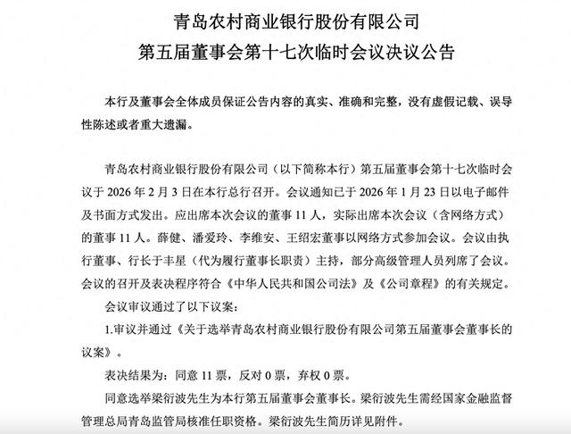 北京商报讯(记者孟凡霞周义力)2月3日,青岛农商行发布第五届董事会第十七次临时会议决议公告,会 议审议并通过了《关于选举青岛农村商业银行股份有限公司第五届董事会董事长的议案》,同意选举梁 衍波为该行第五届董事会董事长。梁衍波需经国家金融监督管理总局青岛监管局核准任职资格。 简历显示,梁衍波,1978年8月生,研究生学历,工商管理硕士学位。曾任博山农商银行党委书记、董 事长,山东省农村信用社联合社菏泽审计中心党委委员、副主任,枣庄农商银行党委书记、董事长,济 南农商银行党委书记、董事长。2025年12月至今,任青岛农商银行党委书记。 同日,该行2026年第一次临时股东会也审议通过了《关于选举梁衍波先生为第五届董事会执行董事的议 案》。 ...