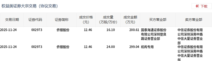 11月24日,侨银股份大宗交易成交40.1万股,成交额499.65万元,占当日总成交额的4.39%,成交价 12.46元,较市场收盘价14.15元折价11.94%。 | 交易日期 | 证券代码 | 证券简称 | 成交价格 | 成交量 | 成交金额 买方营业部 | 卖方营业部 | | --- | --- | --- | --- | --- | --- | --- | | | | | (元) | (万股/万份) | (万元) | | | 2025-11-24 | 002973 | 侨银股份 | 12.46 | 16.10 | 200.61 国泰海通证券股份 | 中信证券股份有限 | | | | | | | 有限公司深圳登良 | 公司深圳深南中路 | | | | | | | 路正券营业部 | 中信大厦证券营业 | | | | | | | | 新 | | 2025-11-24 | 002973 | 侨银股份 | 12.46 | 24.00 | 299.04 机构专用 | 中信证券股份有限 | | | | | | | | 公司深圳深南中路 | | | | | | | | 中信大厦证券营业 | | | | | | | | ...