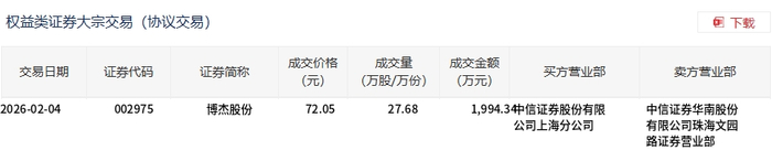 | 交易日期 | 证券代码 | 证券简称 | 成交价格 | 成交量 | 成交金额 买方营业部 | | 卖方营业部 | | --- | --- | --- | --- | --- | --- | --- | --- | | | | | (元) | (万股/万份) | (万元) | | | | 2026-02-04 | 002975 | 博杰股份 | 72.05 | 27.68 | 1,994.34中信证券股份有限 | 中信证券华南股份 | | | | | | | | 公司上海分公司 | 有限公司珠海文圈 | | | | | | | | | 路证券营业部 | | 2月4日,博杰股份大宗交易成交27.68万股,成交额1994.34万元,占当日总成交额的5.08%,成交价 72.05元,较市场收盘价80.05元折价9.99%。 ...