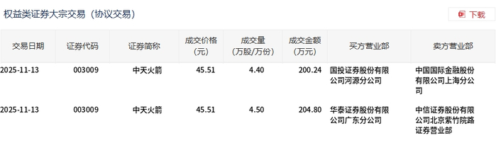 | 交易日期 | 证券代码 | 证券简称 | 成交价格 | 成交量 | 成交金额 买方营业部 | 卖方营业部 | | --- | --- | --- | --- | --- | --- | --- | | | | | (元) | (万股/万份) | (万元) | | | 2025-11-13 | 003009 | 中天火箭 | 45.51 | 4.40 | 200.24 国投证券股份有限 | 中国国际金融股份 | | | | | | | 公司河源分公司 | 有限公司上海分公 | | | | | | | | 리 | | 2025-11-13 | 003009 | 中天火箭 | 45.51 | 4.50 | 204.80 华泰证券股份有限 | 中信证券股份有限 | | | | | | | 公司厂东分公司 | 公司北京繁竹院路 | | | | | | | | 证券量非部 | 11月13日,中天火箭大宗交易成交8.9万股,成交额405.04万元,占当日总成交额的2.21%,成交价45.51 元,较市场收盘价51.09元折价10.92%。 ...
