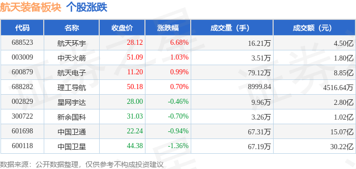 证券之星消息,11月10日航天装备板块较上一交易日上涨1.67%,星网宇达领涨。当日上证指数报收于 4018.6,上涨0.53%。深证成指报收于13427.61,上涨0.18%。航天装备板块个股涨跌见下表: | 代码 | 名称 | 收盘价 | 涨跌幅 | 成交量(手) | 成交额(元) | | --- | --- | --- | --- | --- | --- | | 002829 | 星网宇达 | 29.63 | 6.39% | 21.92万 | 6.38 Z | | 600879 | 航天电子 | 11.48 | 4.74% | 159.06万 | 18.42 Z | | 600118 | 中国卫星 | 45.75 | 2.81% | 81.63万 | 37.43 Z | | 003009 | 中天火箭 | 53.18 | 0.76% | - 3.67万 | 1.95亿 | | 688282 | 理工导航 | 50.72 | 0.22% | 5976.91 | 3017.59万 | | 601698 | 中国 通 | 22.35 | 0.09% | 69.23万 | 15.59亿 | | 300722 | ...