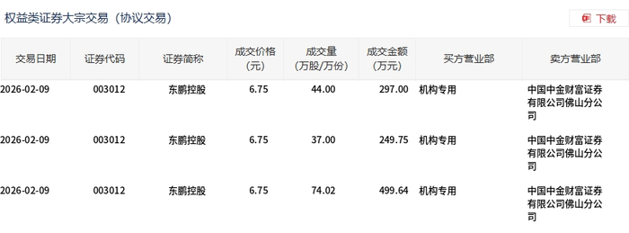 | 交易日期 | 证券代码 | 证券简称 | 成交价格 | 成交量 | 成交全额 买方营业部 | 卖方营业部 | | --- | --- | --- | --- | --- | --- | --- | | | | | (元) | (万股/万份) | (万元) | | | 2026-02-04 | 003012 | 东鹏控股 | 6.60 | 49.00 | 323.40 浙商证券股份有限 | 中国中金财富证券 | | | | | | | 公司金华分公司 | 有限公司佛山分公 | | | | | | | | 司 | | 2026-02-04 | 003012 | 东鹏控股 | 6.60 | 49.00 | 323.40 华泰证券股份有限 | 中国中金财富证券 | | | | | | | 公司南京分公司 | 有限公司佛山分公 | | | | | | | | 司 | | 2026-02-04 | 003012 | 东鹏控股 | 6.60 | 51.00 | 336.60 中国银河证券股份 | 中国中金财富证券 | | | | | | | 有限公司杭州建国 | 有限公司佛山季华 | | | | | | | 北路证券营 ...