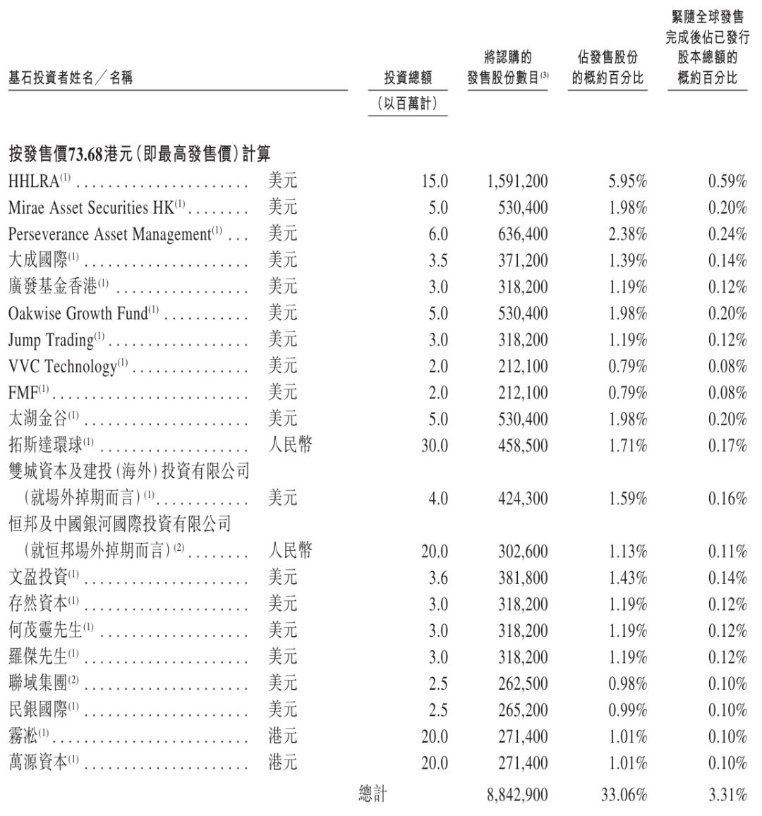 深圳市兆威机电股份有限公司(简称:"兆威机电",股票代码:"2692")日前开启招股,准备2026年3月9日在港交所上市。 兆威机电此次拟全球发售2674.83万股H股,发售价将不高于每股73.68港元,最高募资19.7亿港元。 兆威机电基石投资者分别为高瓴旗下HHLRA、Mirae Asset Securities HK、Perseverance Asset Management、大成国际、广发基金香港、Oakwise Growth Fund、Jump Trading、VVC Technology、FMF,太湖金谷、拓斯达环球、双城资本及建投(海外)投资有限公司(就场外掉期而言)、恒邦及中国银河国 际投资有限公司(就恒邦场外掉期而言)、文盈投资、存然资本、何茂灵、罗杰、联域集团、民银国际、雾凇、万源资本。基石投资者一共认购5.79亿元 (约6.52亿港元)。 其中,HHLRA认购1500万美元,Mirae Asset Securities HK认购500万美元,Perseverance Asset Management认购600万美元,大成国际认购350万美元,广发 基金香港认购300万美元,Oakwise ...