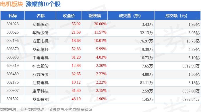 证券之星消息,1月21日电机板块较上一交易日上涨1.34%,奕帆传动领涨。当日上证指数报收于 4116.94,上涨0.08%。深证成指报收于14255.12,上涨0.7%。电机板块个股涨跌见下表: | 代码 | 名称 | 主力净流入(元) | 主力净占比 游资净流入 (元) | | 游资净占比 散户净流入 (元) | | 散户净占比 | | --- | --- | --- | --- | --- | --- | --- | --- | | 002196 方正电机 | | 3.60 Z | 26.21% | -1.23 Z | -8.94% | -2.37 Z | -17.27% | | 603370 华新精科 | | 1.21亿 | 25.24% | -6186.51万 | -12.91% | -5906.50万 | -12.33% | | 301023 奕帆传动 | | 5193.72万 | 27.07% | -3477.05万 | -18.12% | -1716.67万 | -8.95% | | 603728 鸣志电器 | | 3009.53万 | 3.20% | -3015.79万 | -3.21% | ...