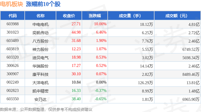 | 代码 | 名称 | 收盘价 | 涨跌幅 | 成交量(手) | 成交额(元) | | --- | --- | --- | --- | --- | --- | | 002176 | 江特电机 | 10.16 | -2.87% | 125.17万 | 12.92亿 | | 600416 | 湘电股份 | 16.14 | -2.77% | 68.66万 | 11.24亿 | | 300660 | 江苏音利 | 53.48 | -2.68% | 15.74万 | 8.54亿 | | 301226 | 祥明智能 | 33.15 | -1.87% | 5.51万 | 1.86亿 | | 603370 | 华新精科 | 46.97 | -1.70% | 2.56万 | 1.21亿 | | 000922 | 佳电股份 | 14.12 | -1.67% | 20.53万 | 2.93亿 | | 600580 | 卧龙电驱 | 46.13 | -1.64% | 107.46万 | 50.12亿 | | 002196 | 方正电机 | 14.78 | -1.53% | 76.86万 | 11.49亿 | | 603728 | 鸣 ...