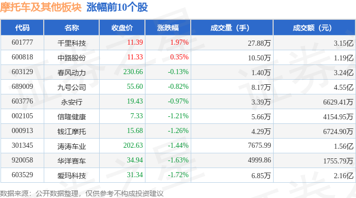 证券之星消息,11月18日摩托车及其他板块较上一交易日下跌0.57%,征和工业领跌。当日上证指数报 收于3939.81,下跌0.81%。深证成指报收于13080.49,下跌0.92%。摩托车及其他板块个股涨跌见下表: | 代码 | 名称 | 收盘价 | 涨跌幅 | 成交量(手) | 成交额(元) | | | --- | --- | --- | --- | --- | --- | --- | | 601777 | 千里科技 | 11.39 | 1.97% | 27.88万 | | 3.15亿 | | 600818 | 中路股份 | 11.33 | 0.35% | 10.50万 | | 1.19亿 | | 603129 | 春风动力 | 230.66 | -0.13% | ● 1.40万 | | 3.24亿 | | 60006899 | 九号公司 | 55.60 | -0.82% | 8.17万 | | 4.55亿 | | 603776 | 永安行 | 19.43 | -0.97% | 3.39万 | | 6629.41万 | | 002105 | 信隆健康 | 7.33 | -1.21% | 5.66万 | | ...