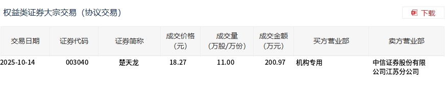 | 交易日期 | 证券代码 | 证券简称 | 成交价格 | 成交量 | 成交全额 | 买方营业部 | 卖方营业部 | | --- | --- | --- | --- | --- | --- | --- | --- | | | | | (元) | (万股/万份) | (万元) | | | | 2025-10-14 | 003040 | 楚天龙 | 18.27 | 11.00 | 200.97 | | 中信证券股份有限 公司江苏分公司 | 10月14日,楚天龙大宗交易成交11万股,成交额200.97万元,占当日总成交额的0.33%,成交价18.27元,较市场收盘价20.95 元折价12.79%。 ...