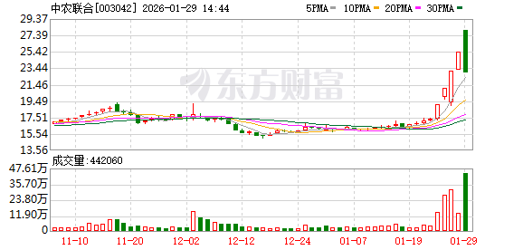 【导读】中农联合盘中走出准"天地板" | | | 中农联合[003042] 2026-01-29 14:44 | | | 5PMA = 10PMA = 20PMA = 30PMA = | | | | | --- | --- | --- | --- | --- | --- | --- | --- | --- | | 29.37 | | | | | | | | | | 27.39 | | | | | | | | | | 25.42 | | | | | | | | | | 23.44 | | | | | | | | | | 21.46 | | | | | | | | | | 19.49 | | | | | | | | | | 17.51 | | | | | | | | | | 15.54 | | | | | | | | | | 13.56 | | | | | | | | | | 47.61万 | 成交量:442060 | | | | | | | | | 35.70万 | | | | | | | | | | 23.80万 | | | | | | | | | | 11.90万 | | | | | | | | | | | ...