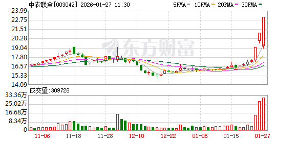 昨日晚间,中农联合发布2025年度业绩预告,公司预计2025年度归属于上市公司股东的净利润亏损1.28 亿元—1.65亿元,上年同期亏损1.22亿元。 | < w | 中农联合(003042) | | | | | --- | --- | --- | --- | --- | | | 交易中 01-27 09:58:57 | | | | | 23.10 | | 额 6.49亿 股本 1.42亿 市盈 -29.6 | | 万得 | | +2.10 +10.00% | | 换 23.9% 市值132.9亿 市净 2.51 | | 盘口 | | 分时 五日 | 日K | 周K 月K | 更多 6 | | | 叠加 | | 均价:21.28 盘口 | | 资金 | | 23.10 | | 10.00% 卖5 | | 0 | | | | 304 33 | | O 0 | | | | 322 | | 0 | | 21.00 | | 0.00% == 1 | | 0 | | | | 156 | 23.10 193670 | | | | | 买2 | 23.09 | 1924 | | | | 蓝3 | 23.08 | 428 | ...