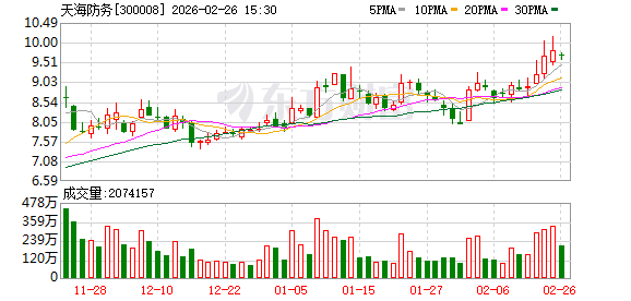 Core Viewpoint - Tianhai Defense (300008) has reported a decline in stock price and has announced guarantees for its subsidiaries, indicating ongoing financial activities and commitments [1]. Financial Performance - As of February 6, 2026, Tianhai Defense's stock closed at 8.63 yuan, down 2.92% from the previous trading day, with a total market capitalization of 14.913 billion yuan [1]. - The stock opened at 8.81 yuan, reached a high of 8.84 yuan, and a low of 8.48 yuan, with a trading volume of 1.016 billion yuan and a turnover rate of 7.11% [1]. Guarantee Announcements - The company plans to provide guarantees for its wholly-owned subsidiary, Jiamei Ocean, for a credit application of up to 10 million yuan from the Industrial and Commercial Bank of China, with a maximum guarantee of 12 million yuan [1]. - Additionally, the company will guarantee up to 8.3 million yuan for its holding subsidiary, Jiangsu Jiuduo, for a credit application of up to 10 million yuan from Jiangsu Bank, with Jiangsu Green Energy providing a 3 million yuan guarantee [1]. - These guarantees are within the company's approved annual guarantee limit of 4.6 billion yuan and do not require additional board or shareholder meetings for approval [1]. Current Liabilities - As of the announcement date, the total amount of external guarantees provided by the company is approximately 4.1885884 billion yuan, which accounts for 200.08% of the audited net assets as of the end of 2024, with no overdue guarantees reported [1].