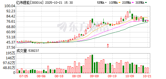 资料显示,惠州亿纬锂能股份有限公司位于广东省惠州市仲恺高新区惠风七路38号,香港铜锣湾希慎道 33号利园1期19楼1910室,成立日期2001年12月24日,上市日期2009年10月30日,公司主营业务涉及消 费电池(包括锂原电池、小型锂离子电池、三元圆柱电池)和动力电池(包括新能源汽车电池及其电池系 统、储能电池)的研发、生产和销售。主营业务收入构成为:动力电池45.26%,储能电池36.56%,消费 电池18.03%,其他0.16%。 亿纬锂能今年以来股价涨69.62%,近5个交易日跌1.30%,近20日涨5.90%,近60日涨70.55%。 10月21日,亿纬锂能(维权)盘中上涨2.00%,截至09:42,报78.02元/股,成交5.40亿元,换手率 0.38%,总市值1596.08亿元。 今年以来亿纬锂能已经1次登上龙虎榜,最近一次登上龙虎榜为9月5日。 资金流向方面,主力资金净流入661.54万元,特大单买入4074.23万元,占比7.54%,卖出4435.18万元, 占比8.21%;大单买入1.26亿元,占比23.42%,卖出1.16亿元,占比21.53%。 分红方面,亿纬锂能A股上市后累计派现3 ...