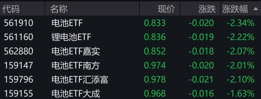 有分析认为,近年来,政策支持为电池行业发展注入了强劲动力。国家持续推出新能源汽车鼓励政策,包括以旧换新、 充电基础设施建设及新能源下乡等,进一步释放了消费潜力。同时,"反内卷"政策的逐步落地促使行业竞争趋于理性, 整体盈利环境有望改善。 每日经济新闻 电池概念股走低,阳光电源、宁德时代、亿纬锂能跌超4%。 受盘面影响,多只电池相关ETF跌超2%。 | 代码 | 名称 | 现价 | | 涨跌 涨跌幅 | | --- | --- | --- | --- | --- | | 561910 | 电池ETF | 0.833 | -0.020 | -2.34% | | 561160 | 锂电池ETF | 0.836 | -0.019 | -2.22% | | 562880 | 电池ETF嘉实 | 0.852 | -0.018 | -2.07% | | 159147 | 电池ETF南方 | 0.974 | -0.020 | -2.01% | | 159796 | 电池ETF汇添富 | 0.978 | -0.021 | -2.10% | | 159155 | 电池ETF大成 | 0.968 | -0.016 | -1.63% ...