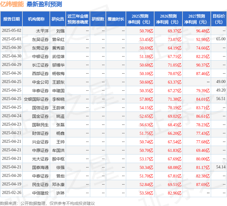天风证券股份有限公司孙潇雅,张童童近期对亿纬锂能进行研究并发布了研究报告《储能高增持续,消费、动 力保持增长》,给予亿纬锂能买入评级。 亿纬锂能(300014) 公司2024Q4/2025Q1重回收入和利润的正增长,具体经营结果数据如下:?24年:收入486亿,YOY-0.4%,归 母/扣非净利润41/32亿元,YOY+0.6%/15%。 24Q4:收入146亿,YOY+10%,QOQ+18%,归母/扣非净利润8.9/6.6亿元,YOY+42%/10%,QOQ- 16%/-34%。 25Q1:收入128亿元,YOY+37%,QOQ-12%,归母净利润11亿元,YOY+3%,QOQ+24%,扣非净利润8.2亿 元,YOY+17%,QOQ+24%。公司2024年分板块经营情况如下: 投资建议:考虑到公司24年利润微增,我们下调25-26年归母净利润为53、70亿元(上次预期67、83亿元), 预计27年实现归母净利润92亿元,维持"买入"评级。 风险提示:电动车销量不及预期、储能需求不及预期、动力&储电池价格下降超预期、行业竞争加剧 最新盈利预测明细如下: | 报告日期 | 机构简称 | 研究员 | 沂三年业绩 ...