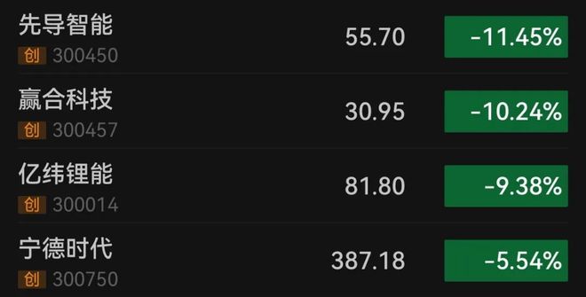 Core Viewpoint - The article discusses the recent performance of several companies in the battery and technology sector, highlighting significant declines in their stock prices. Group 1: Company Performance - Leading Intelligent (先导智能) reported a stock price of 55.70, reflecting a decrease of 11.45% [1] - Winbond Technology (赢合科技) has a stock price of 30.95, down by 10.24% [1] - EVE Energy (亿纬锂能) is priced at 81.80, showing a decline of 9.38% [1] - CATL (宁德时代) has a stock price of 387.18, with a decrease of 5.54% [1]