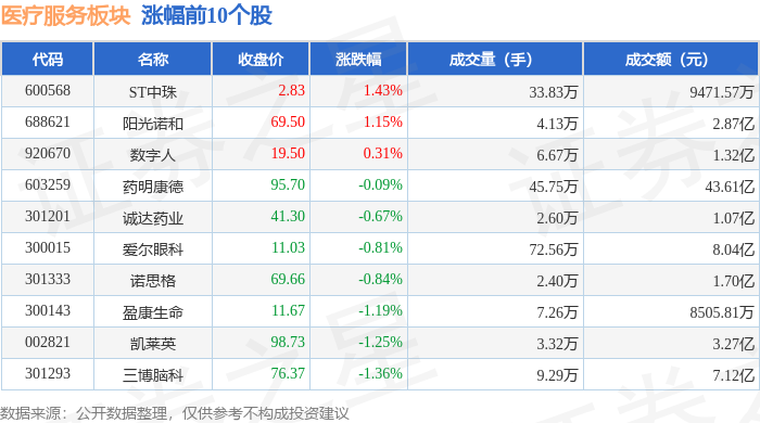 证券之星消息,1月28日医疗服务板块较上一交易日下跌1.64%,光正眼科领跌。当日上证指数报收于 4151.24,上涨0.27%。深证成指报收于14342.9,上涨0.09%。医疗服务板块个股涨跌见下表: | 代码 | 名称 | 收盘价 | 涨跌幅 | 成交量(手) | 成交额(元) | | | --- | --- | --- | --- | --- | --- | --- | | 600568 | ST中珠 | 2.83 | 1.43% | 33.83万 | | 9471.57万 | | 688621 | 阳光诺和 | 69.50 | 1.15% | 4.13万 | | 2.87亿 | | 920670 | 数字人 | 19.50 | 0.31% | 6.67万 | | 1.32亿 | | 603259 | 药明康德 | 95.70 | -0.09% | 45.75万 | | 43.61亿 | | 301201 | 诚达药业 | 41.30 | -0.67% | 2.60万 | | 1.07亿 | | 300015 | 爰尔眼科 | 11.03 | -0.81% | 72.56万 | | 8.04亿 | | ...