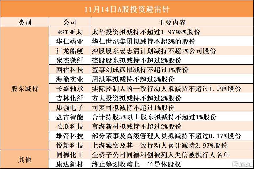 11月14日A股投资避雷针︱康达新材:终止筹划收购北一半导体股权;长盛轴承:实际控制人的一致行动人拟减持不超过1.99%股份