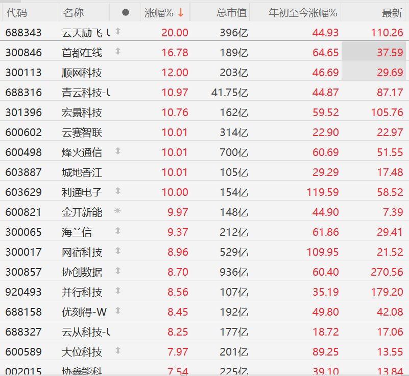 责任编辑:栎树 | 代码 | 名称 | | 涨幅% ↓ | 总市值 | 年初至今涨幅% | 最新 | | --- | --- | --- | --- | --- | --- | --- | | 688343 | 云天励飞-1 1 | | 20.00 | 396亿 | 44.93 | 110.26 | | 300846 | 首都在线 | 1 | 16.78 | 189亿 | 64.65 | 37.59 | | 300113 | 顺网科技 | | 12.00 | 203亿 | 46.69 | 29.69 | | 688316 | 青云科技-l | | 10.97 | 41.75 Z | 44.87 | 87.17 | | 301396 | 宏景科技 | | 10.76 | 162亿 | 59.52 | 105.76 | | 600602 | 云舞智联 | | 10.01 | 314Z | 22.90 | 22.97 | | 600498 | 烽火通信 | 1 | 10.01 | 700亿 | 60.69 | 51.55 | | 603887 | 城地香江 | | 10.01 | 105亿 | 29.29 | 17 ...