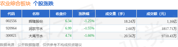 证券之星消息,1月28日农业综合板块较上一交易日上涨1.46%,润农节水领涨。当日上证指数报收于 4151.24,上涨0.27%。深证成指报收于14342.9,上涨0.09%。农业综合板块个股涨跌见下表: | 代码 | | | 名称 | | | | | --- | --- | --- | --- | --- | --- | --- | | 002556 辉隆股份 | 791.22万 | 5.41% | -936.44万 | -6.40% | 145.22万 | 0.99% | | 300021 大禹节水 | 535.14万 | 4.95% | -324.32万 | -3.00% | -210.82万 | -1.95% | | 920964 润农节水 | 303.61万 | 8.16% | 62.18万 | 1.67% | -29.37万 | -0.79% | | 代码 | 名称 | 收盘价 | 涨跌幅 | 成交量(手) | 成交额(元) | | | --- | --- | --- | --- | --- | --- | --- | | 920964 | 润农节水 | 7.16 | 2.43% | 5.19万 ...