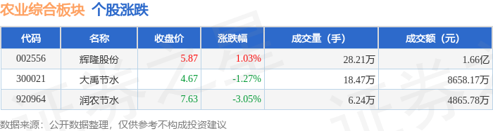 证券之星消息,10月30日农业综合板块较上一交易日上涨0.05%,辉隆股份领涨。当日上证指数报收于 3986.9,下跌0.73%。深证成指报收于13532.13,下跌1.16%。农业综合板块个股涨跌见下表: | 代码 | 名称 | 收盘价 | 涨跌幅 | 成交量(手) | 成交额(元) | | | --- | --- | --- | --- | --- | --- | --- | | 002556 | 辉隆股份 | 5.87 | 1.03% | 28.21万 | | 1.66亿 | | 300021 | 大禹节水 | 4.67 | -1.27% | 18.47万 | | 8658.17万 | | 920964 | 润农节水 | 7.63 | -3.05% | 6.24万 | | 4865.78万 | 从资金流向上来看,当日农业综合板块主力资金净流出2323.49万元,游资资金净流入311.08万元,散户 资金净流入2012.4万元。农业综合板块个股资金流向见下表: | | | | 代码 名称 主力净流入 (元) 主力净占比 游资净流入 (元) 游资净占比 散户净击比 | | | | | --- | --- | ...