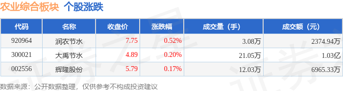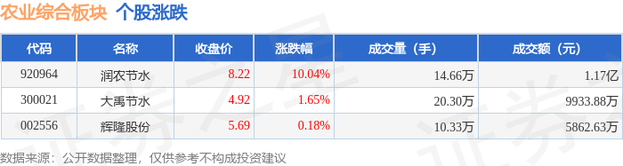证券之星消息,10月27日农业综合板块较上一交易日上涨0.19%,润农节水领涨。当日上证指数报收于 3996.94,上涨1.18%。深证成指报收于13489.4,上涨1.51%。农业综合板块个股涨跌见下表: 以上内容为证券之星据公开信息整理,由AI算法生成(网信算备310104345710301240019号),不构成投资建议。 从资金流向上来看,当日农业综合板块主力资金净流出780.61万元,游资资金净流出556.13万元,散户资 金净流入1336.73万元。农业综合板块个股资金流向见下表: | | | | 代码 名称 主力净流入(元) 主力净占比 游资净流入(元) 游资净占比 散户净占比 | | | | | --- | --- | --- | --- | --- | --- | --- | | 002556 辉隆股份 | -353.25万 | -5.07% | -360.49万 | -5.18% | 713.74万 | 10.25% | | 300021 大禹节水 | -427.36万 | -4.16% | -195.63万 | -1.90% | 622.99万 | 6.06% | | 代码 | 名称 | ...