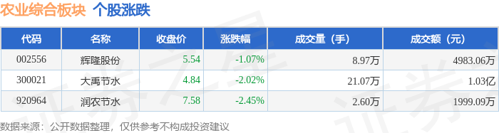 农业综合板块10月16日跌1.5%,润农节水领跌,主力资金净流出2186.83万元