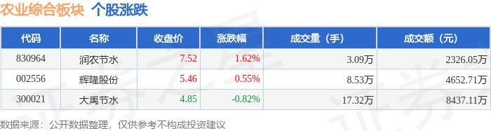 从资金流向上来看,当日农业综合板块主力资金净流入82.02万元,游资资金净流出93.65万元,散户资金 净流入11.63万元。农业综合板块个股资金流向见下表: 证券之星消息,9月30日农业综合板块较上一交易日下跌0.07%,大禹节水领跌。当日上证指数报收于 3882.78,上涨0.52%。深证成指报收于13526.51,上涨0.35%。农业综合板块个股涨跌见下表: | 代码 | 名称 | 收盘价 | 涨跌幅 | 成交量(手) | 成交额(元) | | | --- | --- | --- | --- | --- | --- | --- | | 830964 | 润农节水 | 7.52 | 1.62% | 3.09万 | | 2326.05万 | | 002556 | 辉隆股份 | 5.46 | 0.55% | 8.53万 | | 4652.71万 | | 300021 | 大禹节水 | 4.85 | -0.82% | 17.32万 | | 8437.11万 | | | | | 代码 名称 主力净流入 (元) 主力净占比 游资净流入 (元) 游资净占比 散户净占比 | | | | | --- | --- | -- ...