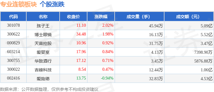 从资金流向上来看,当日专业连锁板块主力资金净流出6668.62万元,游资资金净流出2857.15万元,散户 资金净流入9525.77万元。专业连锁板块个股资金流向见下表: 证券之星消息,1月23日专业连锁板块较上一交易日上涨0.68%,孩子王领涨。当日上证指数报收于 4136.16,上涨0.33%。深证成指报收于14439.66,上涨0.79%。专业连锁板块个股涨跌见下表: | 代码 | 名称 | 收盘价 | 涨跌幅 | 成交量(手) | 成交额(元) | | --- | --- | --- | --- | --- | --- | | 301078 | 孩子王 | 11.10 | 2.02% | 45.94万 | 5.09亿 | | 300622 | 博士眼鏡 | 34.48 | 1.98% | 16.13万 | 5.52亿 | | 000829 | 天音控股 | 10.96 | 0.92% | 31.75万 | 3.47 Z | | 603214 | 爱歌室 | 17.96 | 0.84% | 4.13万 | 7398.90万 | | 300755 | 华致酒行 | 17.12 | 0.71% | 3.45 ...