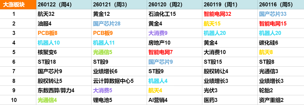 一、当日行情分析 1、市场观察 1月22日,市场午后震荡回升,三大指数集体翻红,创业板指走势较强。沪深两市成交额2.69万亿,较上一个交易日放量910亿。截至收盘,沪指涨0.14%, 深成指涨0.5%,创业板指涨1.01%。 | 大涨板块 | 260122 (周4) | 260121 (周3) | 260120 (周2) | 260119 (周1) | | --- | --- | --- | --- | --- | | 1 | 航天32 | 黄金12 | 石油化工15 | 智能电网32 | | 2 | 油服4 | 国产商片28 | 黄金4 | 航天15 | | 3 | PCB板8 | PCB板9 | 大消费9 | 机器人20 | | র্ব | 机器人10 | 机器人11 | 房地产10 | 黄金4 | | 5 | 核聚变6 | 光通信5 | 智能电网7 | 大消费10 | | 6 | ST股18 | STH59 | 国产市计9 | STHIS15 | | 7 | 国产芯片9 | 业绩增长6 | STH59 | 股权转让4 | | 8 | 股权转让5 | 云计算数据中心5 | 机器人4 | 业绩增长3 | | ...