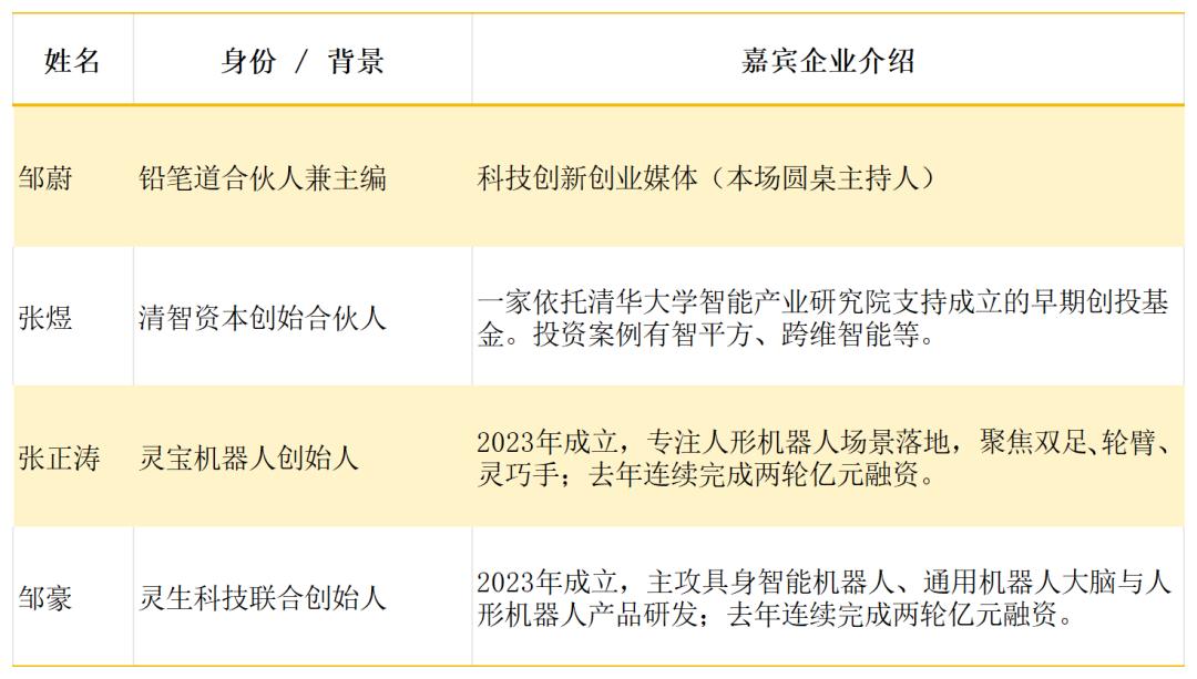 1月28日,由铅笔道联合主办的中关村早期投资论坛暨2026新场景大会举行,影响力登上活动行北京总榜第1名。本文为大会《人形机器人跑得 快,但钱好赚吗?》圆桌讨论实录。 以前春晚,大家看的是节目,但去年开始,大家开始关注:人形机器人是不是要整点新活了。但表演、跳舞等,真的是机器人的天花板吗?显然不是。 本文将击穿这个问题,为您详细解读:人形机器人最容易赚钱的机会,以及最不容易赚钱的机会;哪些愿景是可期的,哪些是短期克服不了的。 参与讨论的嘉宾包含:1位长期关注人形机器人的投资人,2位人形机器人创业家(见下表)。 | 姓名 | 身份 / 背景 | 嘉宾企业介绍 | | --- | --- | --- | | 邹殿 | 铅笔道合伙人兼主编 | 科技创新创业媒体(本场圆桌主持人) | | 张煊 | 清智资本创始合伙人 | 家依托清华大学智能产业研究院支持成立的早期创投基 金。投资案例有智平方、跨维智能等。 | | 张正涛 | 灵宝机器人创始人 | 2023年成立,专注人形机器人场景落地,聚焦双足、轮臂、 灵巧手;去年连续完成两轮亿元融资。 | | 邹豪 | 灵生科技联合创始人 | 2023年成立,主攻具身智能机器人、 ...
