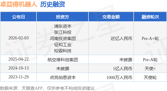 上海卓益得机器人有限公司(DroidUp)是一家专注于通用人形机器人研发、生产及销售的创新型企业。公司拥有国际领先的多模态人工智能肢 体仿生技术,用高效的人形机器人,为科教、工业、服务、康养等场景的应用提供世界级领先的具身智能解决方案。公司研发团队在双足运动控 制和跨模态任务学习方面拥有超过20年的技术积累和人才储备,主要产品有通用人形机器人平台、高仿真表情机器 人、通用人形机器人技能研发 与教学平台等。 | 公布日 | 投资方 | 交易全额 | 融资轮次 | | --- | --- | --- | --- | | 2026-02-03 | 浦东资本 张江科投 | 近亿人民币 | Pre-A+轮 | | | 河南投资集团 | | | | | 征和工业 | | | | | 松景科技 | | | | 2025-04-22 | 航空港科创集团 | 未披露 | Pre-A轮 | | 2024-10-13 | 未披露 | 1亿人民币 | 天使+ | | 2023-11-29 | 点亮伯恩资本 | 1000万人民币 | 天使轮 | 数据来源:天眼查APP 以上内容为证券之星据公开信息整理,由AI算法生成(网信算备3101 ...