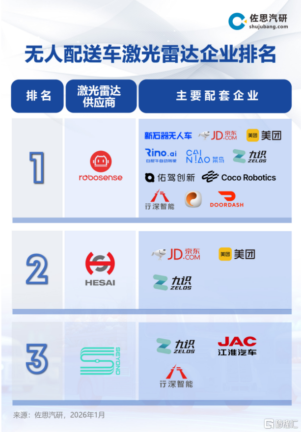 2026年2月24日,佐思产研发布最新行业数据:高潜力的无人配送车细分市场,速腾聚创的激光雷达搭 载量已稳居行业第一。新石器、九识、白犀牛、京东、美团、菜鸟,乃至海外的Coco Robotics、 Doordash,这些占据市场超90%份额的头部玩家,均选择了速腾聚创作为核心供应商。当国家邮政局在 今年1月明确将出台加快推广应用无人配送技术政策文件时,意味着速腾聚创在无人配送机器人领域的 领先地位将兑换成2026年的业绩爆点。 就在2月19日,速腾聚创用一份超出预期的盈利预告,向资本市场释放了重大利好。公司预计2025年第 四季度将首次实现单季度盈利,盈利规模不低于人民币6000万元,大幅超越管理层此前做出的盈亏平衡 预期。资本市场对此报以热烈回应,股价盘中一度涨超15%。这不仅是数字上的转折点,更标志着这 家"港股激光雷达第一股"正式迈入了盈利周期。 驱动这一跨越的核心是机器人业务的战略布局。2025年,其机器人激光雷达销量突破30.3万台,同比激 增超11倍,一举夺得全球销量、割草机器人销量及人形机器人出货量三项冠军。第四季度该业务销量达 22.12万台,与ADAS业务并驾齐驱,成为核心增长极。包括此次机 ...