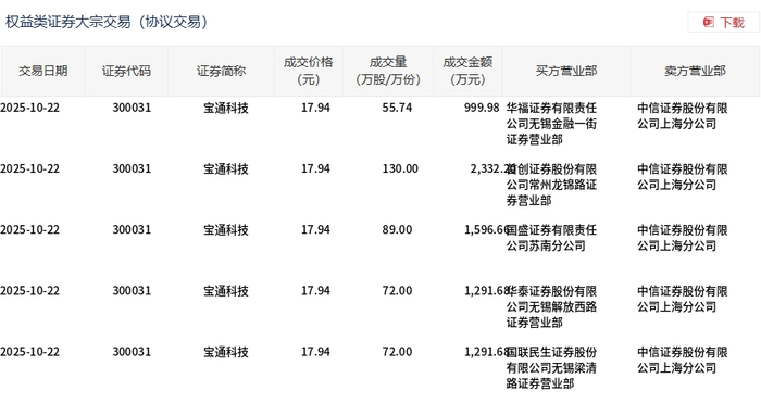 10月22日,宝通科技大宗交易成交418.74万股,成交额7512.2万元,占当日总成交额的32.74%,成交价 17.94元,较市场收盘价22.3元折价19.55%。 | 交易日期 | 证券代码 | 证券简称 | 成交价格 | 成交量 | 成交金额 买方营业部 | 卖方营业部 | | --- | --- | --- | --- | --- | --- | --- | | | | | (元) | (万股/万份) | (万元) | | | 2025-10-22 | 300031 | 宝通科技 | 17.94 | 55.74 | 999.98 华福证券有限责任 | 中信证券股份有限 | | | | | | | 公司无锡金融一街 | 公司上海分公司 | | | | | | | 证券营业部 | | | 2025-10-22 | 300031 | 宝通科技 | 17.94 | 130.00 | 2,332.20创证券股份有限 | 中信证券股份有限 | | | | | | | 公司常州龙锦路证 | 公司上海分公司 | | | | | | | 券营业部 | | | 2025-10-22 | 300031 | 宝通科技 | ...