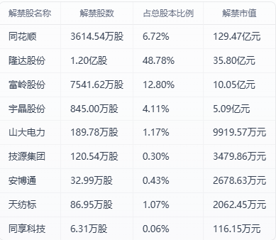 周五(1月23日),巨灵数据统计显示,共有9家公司限售股解禁,合计解禁量为2.45亿股,按最新收盘 价计算,合计解禁市值为182.24亿元。 从解禁市值来看,同花顺、隆达股份、富岭股份解禁市值居前,解禁市值分别为129.47亿元、35.80亿 元、10.05亿元。 股票频道更多独家策划、专家专栏,免费查阅>> 责任编辑:栎树 从解禁量来看,隆达股份、富岭股份、同花顺解禁量居前,解禁股数分别为1.20亿股、7541.62万股、 3614.54万股。 从解禁股数占总股本比例来看,隆达股份、富岭股份、同花顺解禁比例居前,解禁比例分别为 48.78%、12.80%、6.72%。 | 解禁股名称 | 解禁股数 | 占总股本比例 | 解禁市值 | | --- | --- | --- | --- | | 同花顺 | 3614.54万股 | 6.72% | 129.47亿元 | | 隆达股份 | 1.20亿股 | 48.78% | 35.80 Z元 | | 富岭股份 | 7541.62万股 | 12.80% | 10.05亿元 | | 宇晶股份 | 845.00万股 | 4.11% | 5.09亿元 | | 山大电力 | 1 ...