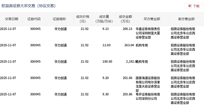 Core Insights - On November 7, Huazhong Technology Co., Ltd. executed a block trade of 1.3963 million shares, amounting to 30.6069 million yuan, which represented 2.9% of the total trading volume for the day [1] - The transaction price was 21.92 yuan, reflecting a discount of 9.16% compared to the market closing price of 24.13 yuan [1] Trading Details - The block trade occurred on November 7, 2025, with the following details: - Security Code: 300045 - Security Name: Huazhong Technology - Transaction Price: 21.92 yuan - Transaction Volume: 139.63 million shares - Total Transaction Amount: 30.6069 million yuan [2] - Major buyers included Huaxin Securities and various institutional investors, while the seller was primarily from China Merchants Securities [2]