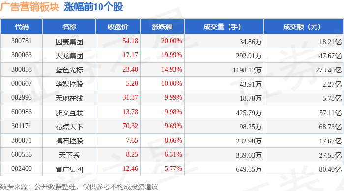 从资金流向上来看,当日广告营销板块主力资金净流入59.16亿元,游资资金净流出33.63亿元,散户资金 净流出25.52亿元。广告营销板块个股资金流向见下表: | 代码 | 名称 | 主力净流入 (元) | 主力净占比 游资净流入 (元) | | 游资净占比 散户净流入(元) | | 散户净占比 | | --- | --- | --- | --- | --- | --- | --- | --- | | 300058 | 蓝色光标 | 28.98 Z | 10.60% | -17.17 Z | -6.28% | -11.81亿 | -4.32% | | 600986 浙文互联 | | 10.51亿 | 18.41% | -5.23 Z | -9.17% | -5.28 Z | -9.24% | | 300063 | 天龙集团 | 5.69亿 | 11.93% | -2.85 Z- | -5.98% | -2.83 Z- | -5.94% | | 300781 | 因害隻闭 | 4.21 乙 | 23.15% | -2.79 Z- | -15.32% | -1.43 乙 | -7.83% | | 002400 | ...