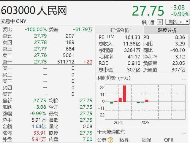 Group 1 - The A-share market's AI application stocks experienced a collective decline, with notable stocks like Xinhua Net and People.cn hitting the daily limit down [1] - Xinhua Net (603888) and People.cn (603000) both faced significant drops, with People.cn down by 9.99% [2][3] - Other companies such as Kunlun Wanwei and BlueFocus also showed marked corrections in their stock prices [1] Group 2 - People.cn reported a total revenue of 1.138 billion CNY, reflecting a year-on-year decrease of 3.29%, and a net profit of 33.64 million CNY, down 40.10% year-on-year [2] - Xinhua Net's total revenue was 1.306 billion CNY, with a net profit of 203 million CNY, which is a year-on-year increase of 30.56% [4] - The market capitalization of People.cn is 30.7 billion CNY, while Xinhua Net's market capitalization stands at 17.7 billion CNY [2][4]
