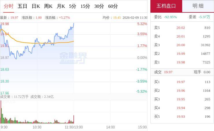 交易所数据显示,2月9日,蓝色光标开盘后短暂冲高,随后整体呈现震荡下行走势,盘中触及低点;此 后股价逐步震荡回升,盘中多次出现反弹,临近上午收盘前再度冲高,截至11:30,表现出较强的回升 动能,整体走势先抑后扬,波动幅度较为显著。 | 分时 五日 日K 周K 月K 5分 15分 30分 60分 | | | | 五档盘口 | | 明细 | | --- | --- | --- | --- | --- | --- | --- | | 最新:19,97 | 涨跌额:1.00 涨跌幅:+5.27% | 均价:19,45 2026-02-09 11:30 | | 委比 -92.95% | | 委差 -5.37万 | | 19.98 | | | 5.32% | 英5 | 20.02 | 810 | | 19.64 | | | 3.55% | 卖4 | 20.01 | 1295 | | 19 8 | | | 1.77% | 卖3 | 20.00 | 31392 | | 18.97 | | | | 卖2 | 19.99 | 14877 | | | JR.HOOI)1 | | 0.00% | 英1 | 19.98 | 7325 ...