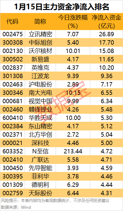 9个行业获主力资金净流入。 据证券时报·数据宝统计,今日(1月15日)沪深两市主力资金净流出509.2亿元,其中创业板净流出 302.36亿元,沪深300成份股净流入53.17亿元。 行业板块方面,申万一级11个行业上涨,电子、基础化工和有色金属行业涨幅居前,均超1%;建筑材 料、电力设备、房地产和通信等行业均小幅上涨。20个下跌行业中,综合行业跌3.35%,居首;国防军 工、传媒和计算机行业跌幅居前,均超2%。 从资金流向来看,申万一级行业中,9个行业主力资金净流入。电子行业主力资金净流入金额居首,为 99.72亿元;银行行业主力资金净流入达16.34亿元,基础化工、房地产、交通运输和煤炭等行业主力资 金净流入均超2亿元。 消费电子龙头股立讯精密主力资金净流入居首,达26.89亿元,股价上涨7.07%。 光模块龙头股中际旭创主力资金净流入17.7亿元,居次席。铜缆高速连接概念股沃尔核材涨停,主力资 金净流入15.08亿元。龙虎榜数据显示,上榜席位合计净买入8.29亿元;其中深股通净买入2.54亿元,游 资"量化打板"位列买三席位,净买入1.58亿元。 | | | 1月15日主力资金净流入排名 | | | - ...
